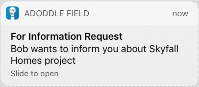 Notifications on Field App: We will let you know when you are out and about what you need to respond in good time. By clicking on the notifications for that action will take you directly to the relevant screen within Adoddle Field.